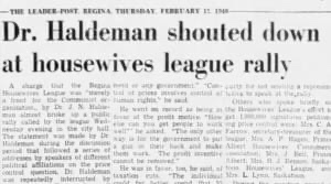 Haldeman criticized their idea as a “strictly socialist resolution” and accused the league of being “a front for the communist organization.” According to the Regina Leader-Post, “Dr. Haldeman was repeatedly interrupted by ‘boos’ and catcalls.”