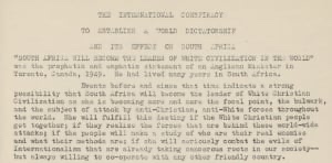 “‘SOUTH AFRICA WILL BECOME THE LEADER OF WHITE CIVILIZATION IN THE WORLD’ was the prophetic and emphatic statement of an Anglican Minister in Toronto, Canada, 1949. He had lived many years in South Africa.” Haldeman published a 48-page book entitled The International Conspiracy to Establish a World Dictatorship and its Menace to South Africa in May 1960. (Joshua Haldeman)