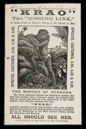 - In advertisements in the late 1800s, Farini promoted a young girl named Krao as the Missing Link, announcing she was ‘living proof of Darwin’s theory of the descent of man.’ (Public domain)