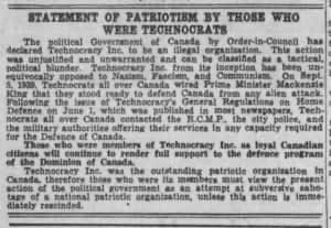 Haldeman was apparently not intimidated by this move. He placed an ad in the Regina Leader-Post promoting Technocracy and calling the government’s move an “unjustified…. political blunder.”